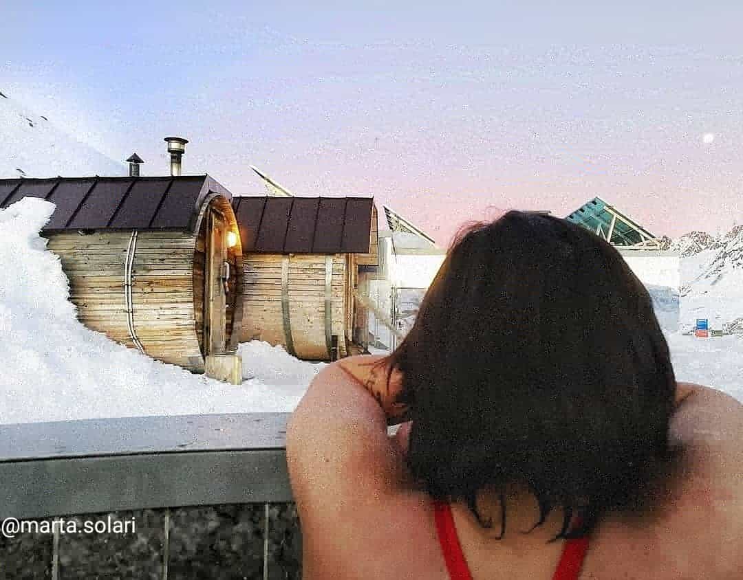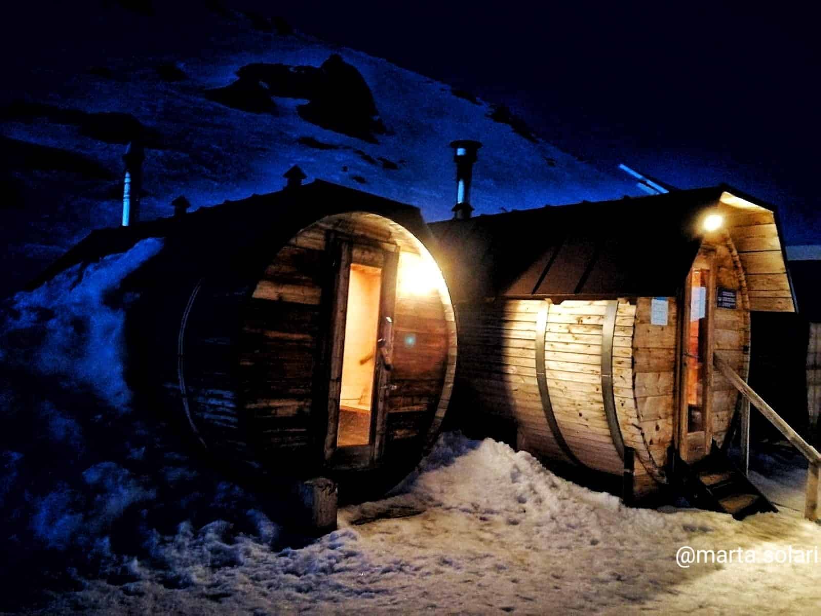 Il servizio igloo, chiamiamolo così, viene gestito con indubbio savoir faire dai gestori del rifugio Bellavista che svetta a 2845mt di altezza tra le Dolomiti. Dopo aver depositato i bagagli per il trasporto fino al rifugio in teleferica, si cambiano una funivia e due seggiovie che si snodano tra i ripidi pendii innevati fino a raggiungere il nostro passaggio in motoslitta fino al rifugio. Insomma, sto igloo te lo devi proprio meritare. Una volta arrivati poi, dopo un pranzo a base di specialità tipiche trentine, viene assegnata una stanza e vi vengono mostrate la sauna e la vasca riscaldata proprio tra le nevi che circondano il rifugio. Credo che l’aspetto più traumatico di tutto questo sia dover camminare in accappatoio tra la neve per raggiungere l’agognato eden del relax, ma indubbiamente la vista delle montagne al tramonto contribuisce a far sentire meno la morsa del freddo e gli arti atrofizzati.
